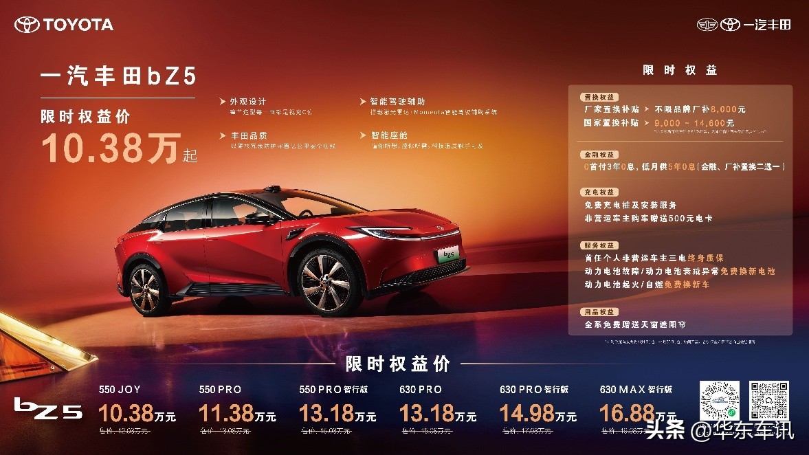 纯电车型bZ5在4月推出限时权益加码,置换权益升级为不限品牌厂补8000元,更可叠加9000-14600元的国家置换补贴,550JOY车型叠加厂补及国补后,限时权益价低至10.38万元。金融权益也是诚意满满,0首付3年0息,低月供5年0息,降低购车门槛(置换、金融二选一)。同时匹配免费充电桩、500元电卡、非营运车主三电终身质保及电池三兜底保障政策,为后续用车提供安心保障。4月购车用户还可免费获赠天窗遮阳帘,舒适加倍。